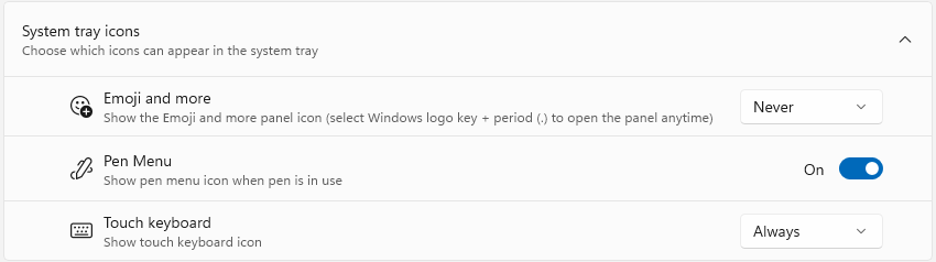 Next, you’ll find Taskbar corner icons, which control small icons that appear near the system tray. These include:
